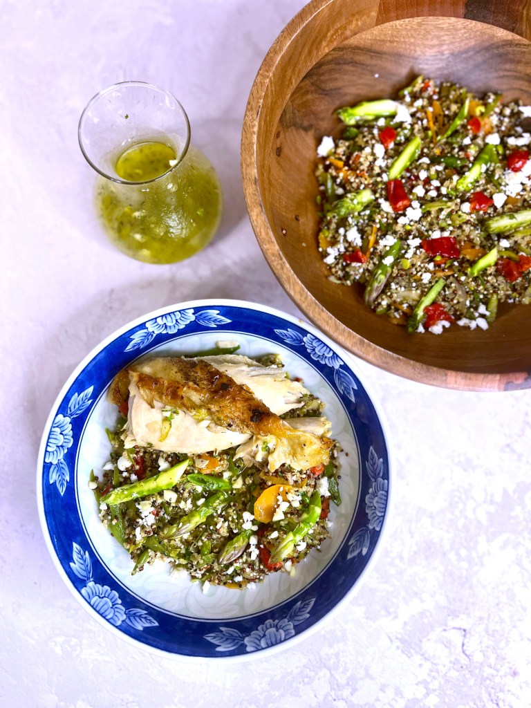 - Mix the cooked quinoa and vegetables into one large bowl. Season with salt and pepper. Add in fresh herbs. Toss lightly in dressing (see below) and add sliced nuts and feta, if desired