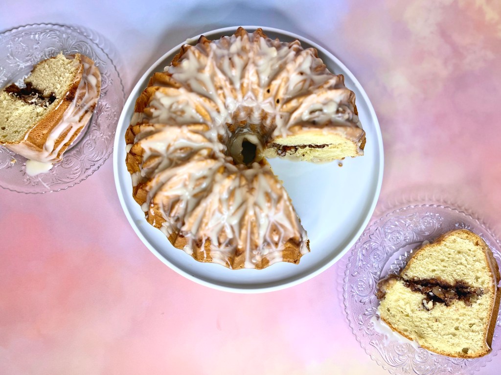 - Add half of the batter to your Bundt pan. Sprinkle the pecan filling over the top and add the remaining batter. Smooth the top with a spatula. Bake for about 70 minutes or until a skewer inserted in the middle comes out clean. Allow the cake to rest in the pan for 5 minutes and then invert onto a wire rack and allow to cool completely.