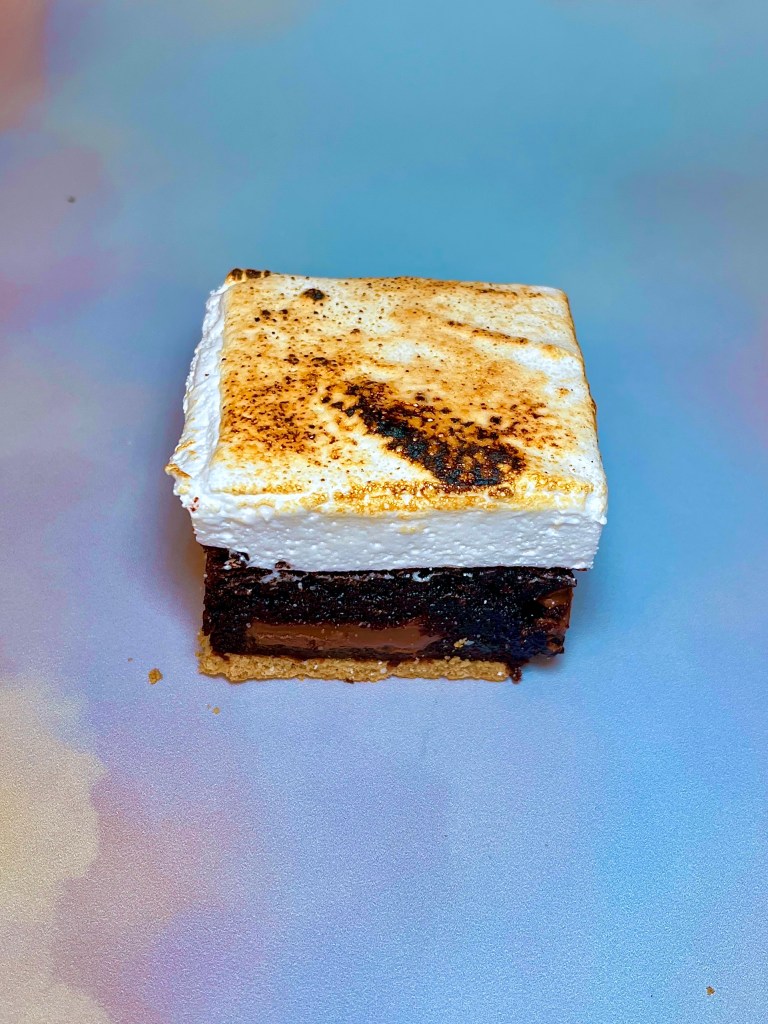 - When ready, pour the marshmallow mixture on top of the brownies. (I like to spray the parchment tabs before this to ensure it can pull away later.) Using a lightly oiled spatula, spread marshmallow fluff evenly in the pan. Place cornstarch and sugar mixture in a fine-mesh strainer, and dust marshmallow top with the cornstarch mixture to cover lightly. Allow the marshmallows to sit uncovered for at least 4 hours and up to overnight. (If you have additional marshmallow, pour into a greased tupperware dusted with powder.)