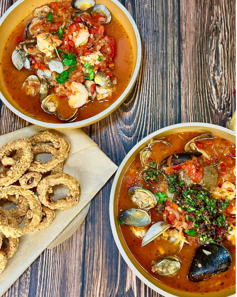 The stew, without seafood, can be made 2 days ahead and stored in the refrigerator, covered. When ready to serve, bake the fish and bring the stew to a simmer before adding the seafood.
