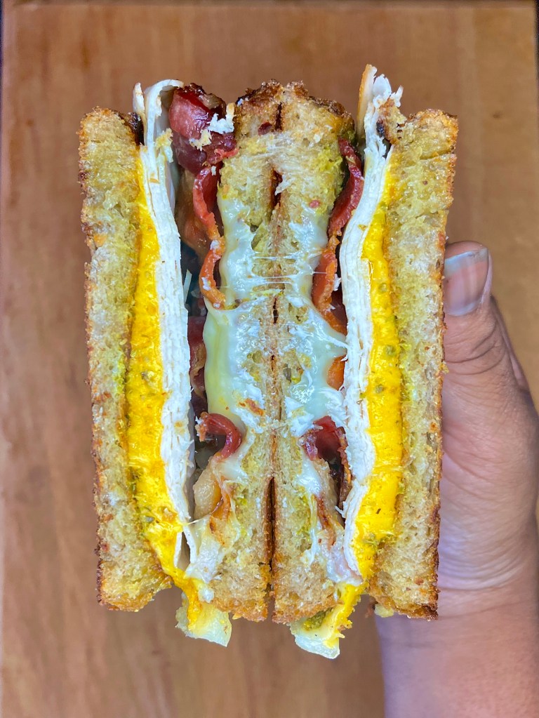 - Prepare sandwich: Place bread slices down, toasted side up (see Note in Step 1). If using pesto or other spread (not chutney), spread an even layer onto one piece of toast. Place cheese down next, and then add filling (meat, 3 to 4 tablespoons chutney or chocolate). Fold the sandwich together and add an even layer of mayo on one of the untoasted sides.