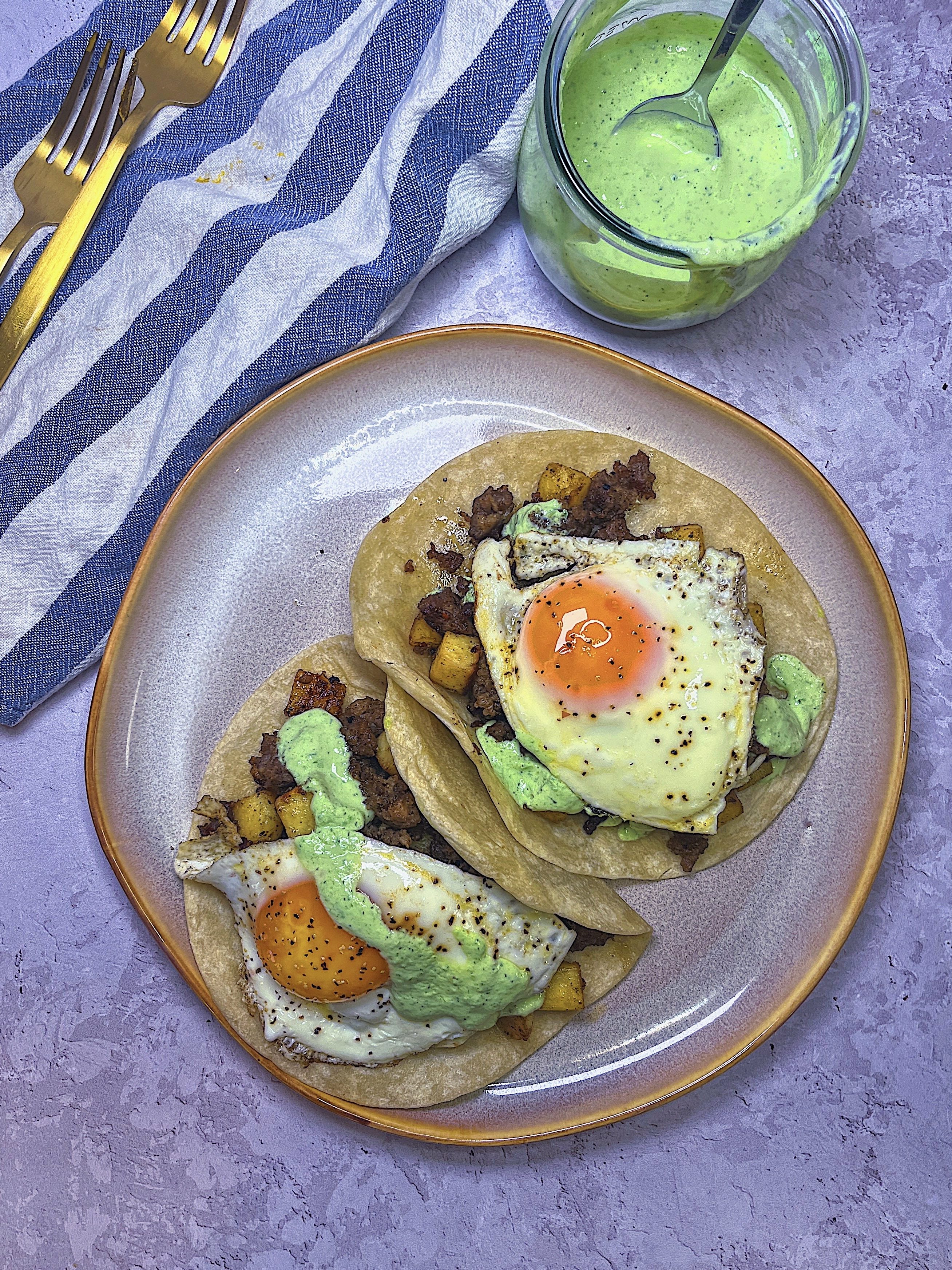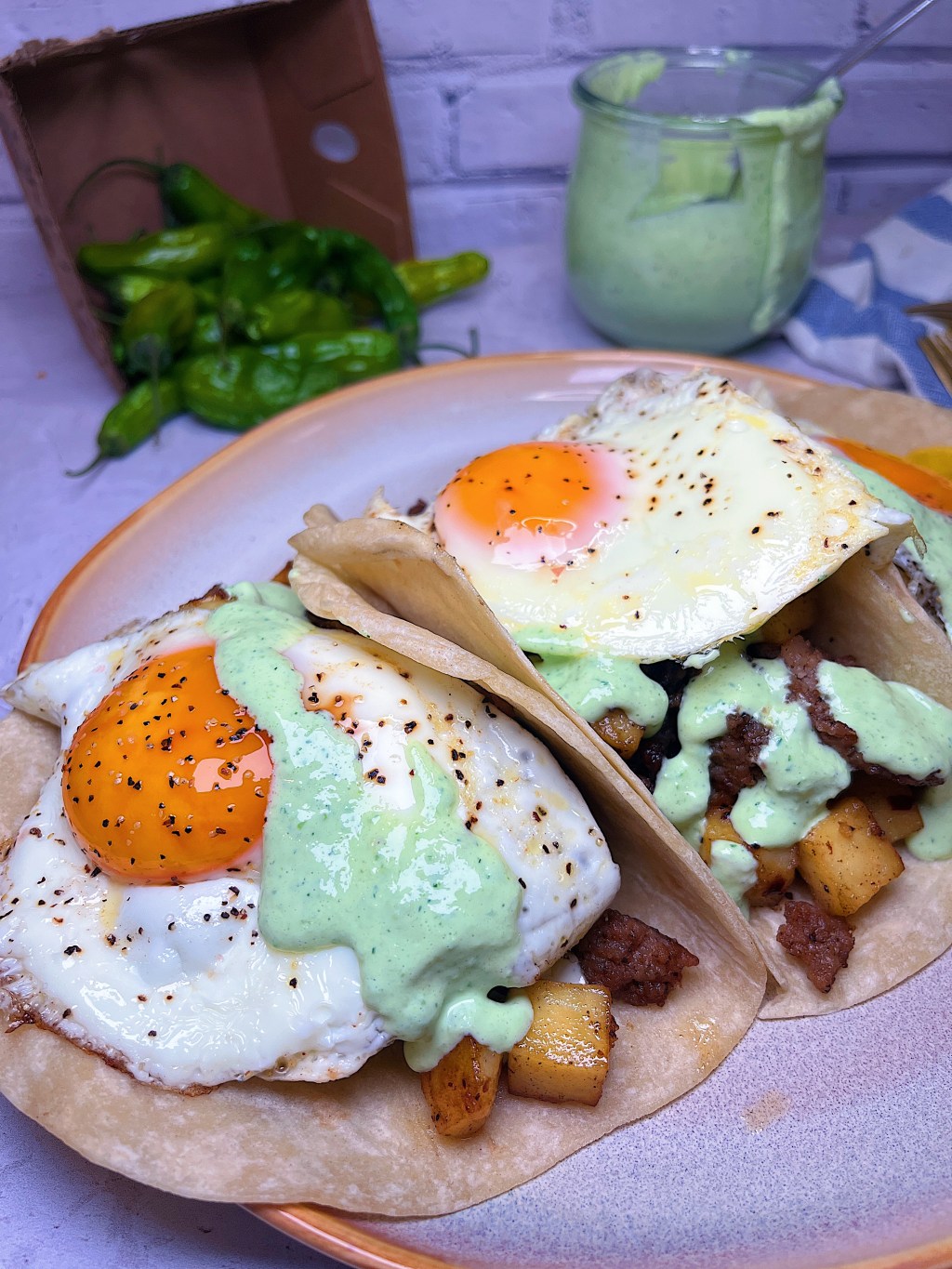 - To assemble tacos, place your preferred amount of filling on a tortilla, top with an egg and drizzle with crema, and enjoy!