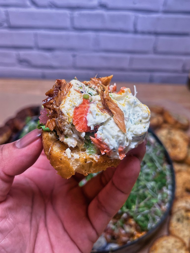 - Layer 5: Combine smoked salmon with chili crisp, and spread over the fourth layer.