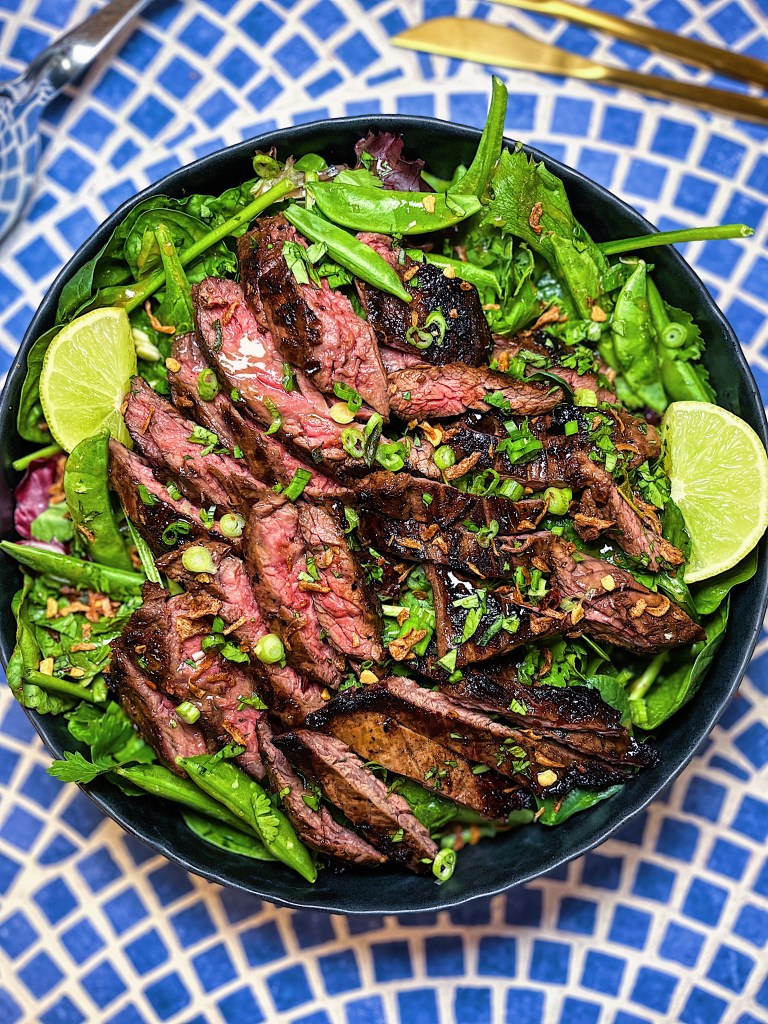 his dish is all about getting your feet up immediately. While I do love cleaning out the fridge and using fresh vegetables, spending less time chopping vegetables is also a good idea. If you have a favorite salad mix, give it a shot! The flavors here are Thai-inspired, with umami flavors pulling from sauces and acids. I personally recommend cabbage-based salads as an alternative; a Thai Crunch salad or a crunchy cabbage blend is always the go-to grab to match the vibrant textures of the juicy, savory-sweet beef