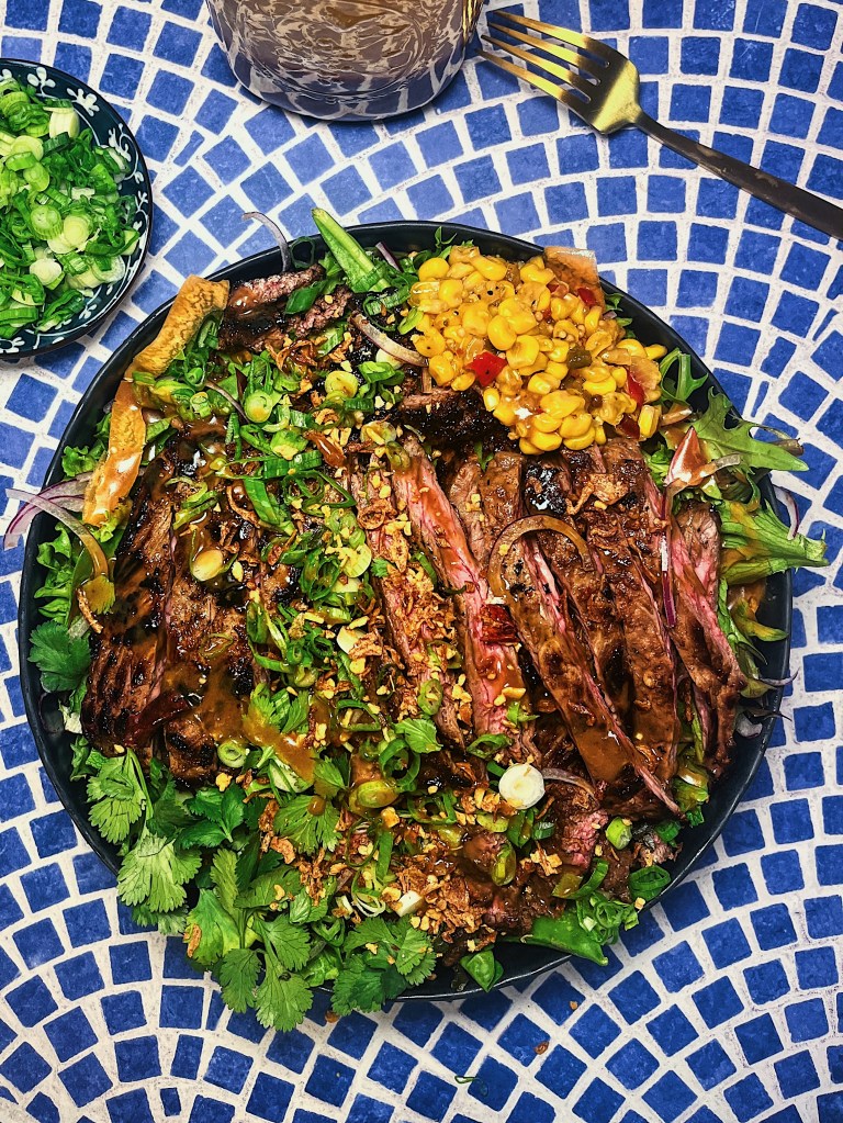 - After the steak has rested, slice against the grain and serve on top of the salad. Garnish with green onions, fried onions and dressing before serving. Enjoy!