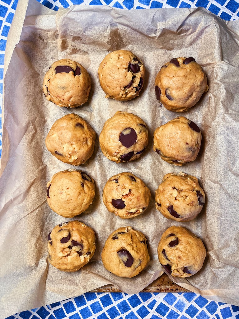 - Scope the cookie dough into 95-gram (5-tablespoons) balls onto a baking sheet . (Optionally, if you want thicker cookies, you can chill the dough balls for 10 minutes in the freezer before cooking.)